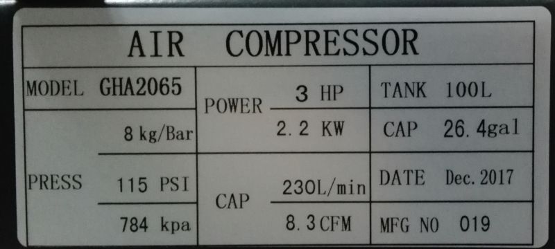 Air Pressure: 8 Bar / 115 Psi