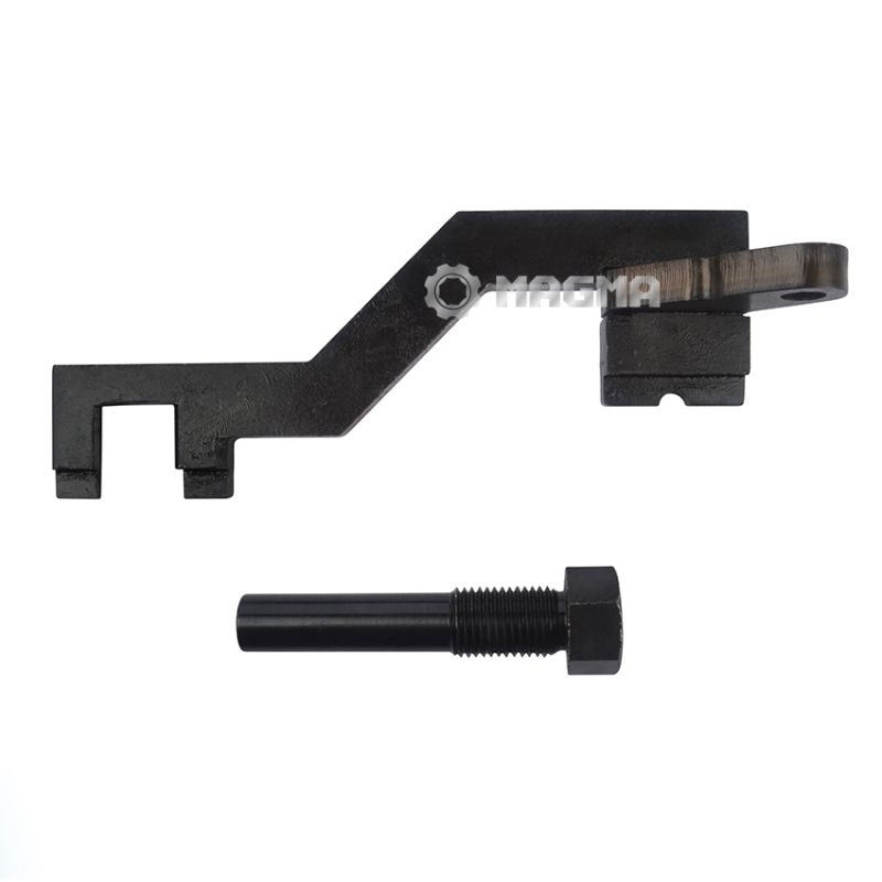 Two piece kit consisting of the components required to lock the crankshaft and camshafts in their timed positions to allow the removal and replacement of the camshaft timing belt.