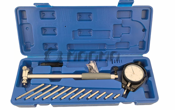 High-precision dial bore gauge with a range of 50-160mm and 0.01mm graduation. Ideal for measuring internal diameters, cylinder taper, and out-of-roundness. Includes a set of interchangeable anvils and spacers in a protective case.