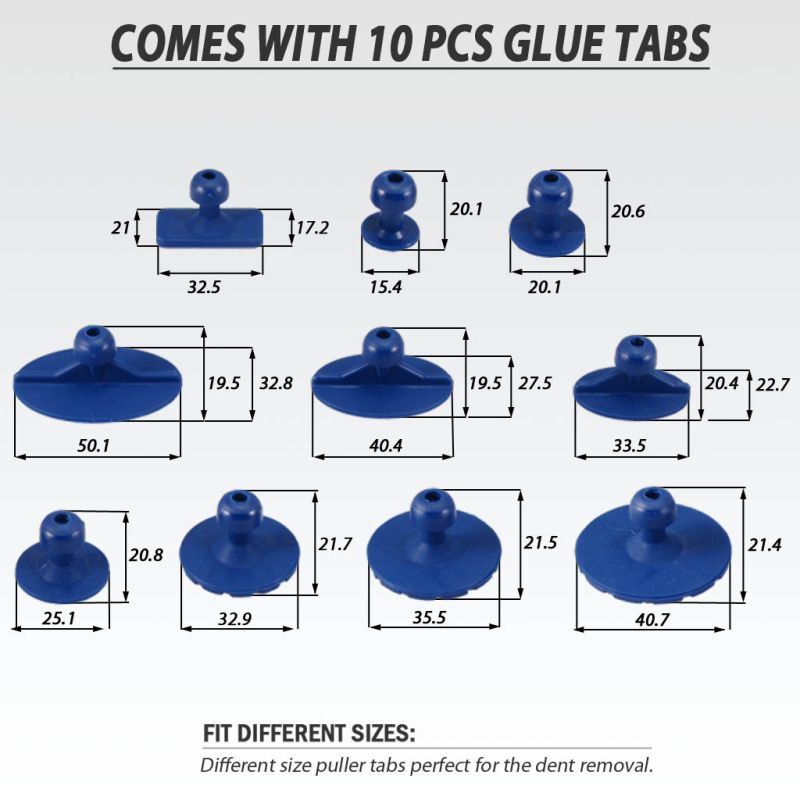 Περιλαμβάνεται 10 τεμάχια κολλητικά πλακάκια και ένα μίνι σφυρί ολίσθησης για τη μείωση μικρών βαθουλωμάτων στο αμάξωμα του οχήματος. Συνιστάται για χειροκίνητη λειτουργία.